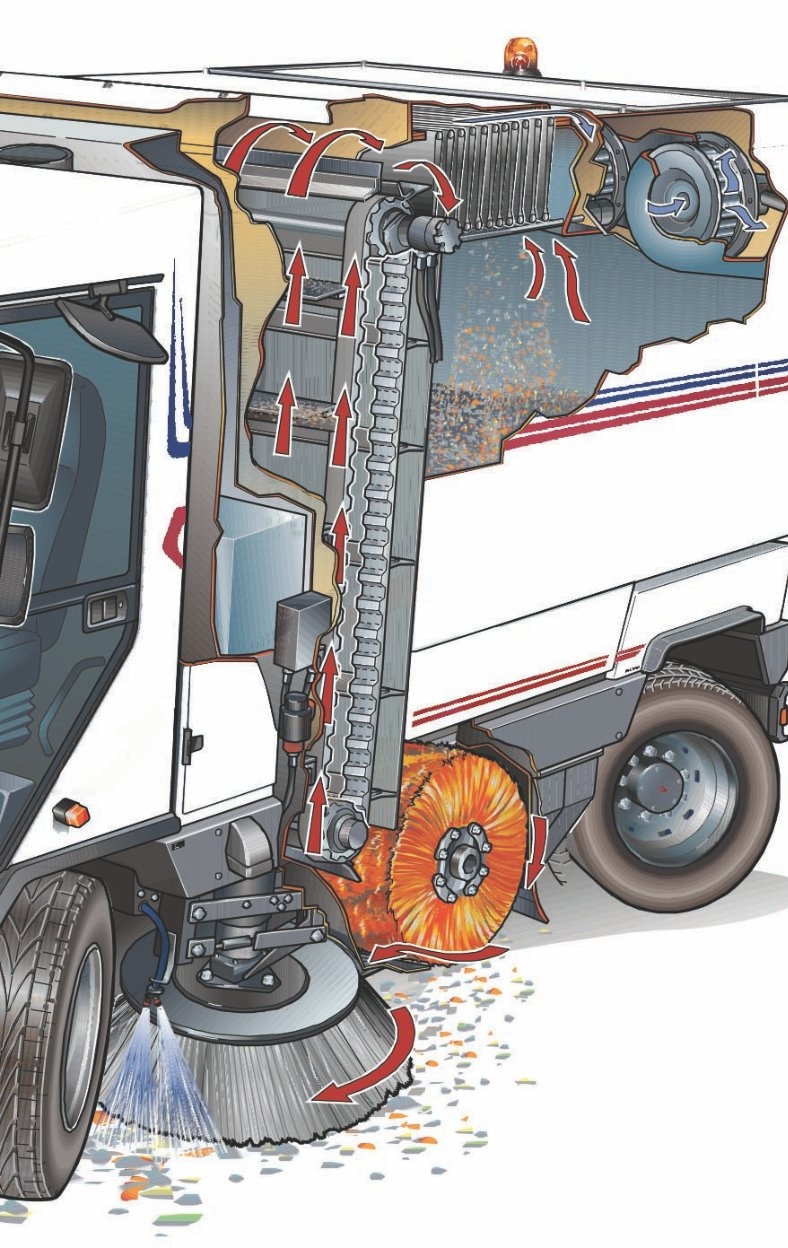 De Dulevo D3, D6 en D6 Veloce zijn de enige mechanisch vacuüm straatveegmachines waarbij een walsborstel over de volledige veegbreedte het vuil fysiek oppakt en via een transportband naar de container brengt. In de volksmond heet dit het veger-en-blik veegprincipe, en dat beschrijft precies de werking. Er is geen luchtstroom nodig om het vuil te verplaatsen, waardoor de machines niet verstoppen op blad, takken, kledinghangers of grof marktafval.