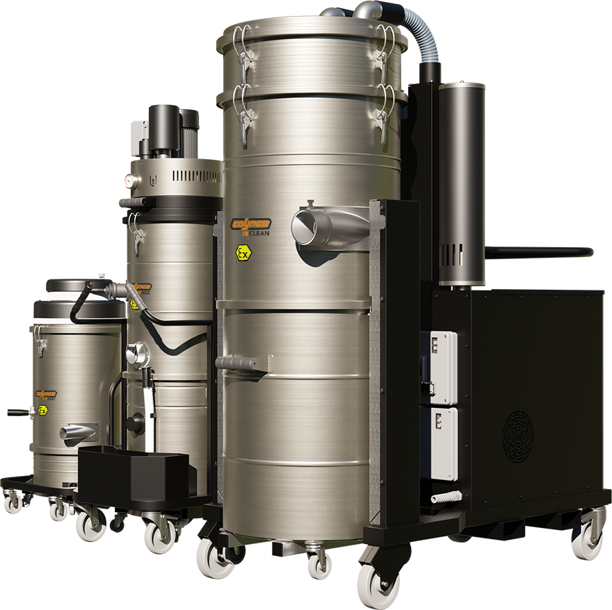 Het assortiment ATEX stofzuigers wordt geproduceerd met vermogens van 1 tot 22 kW zowel met 230V – borstelloze elektromotor als een 380V uitvoering met zijkanaal turbinemotor.