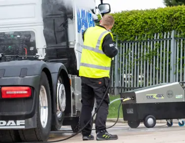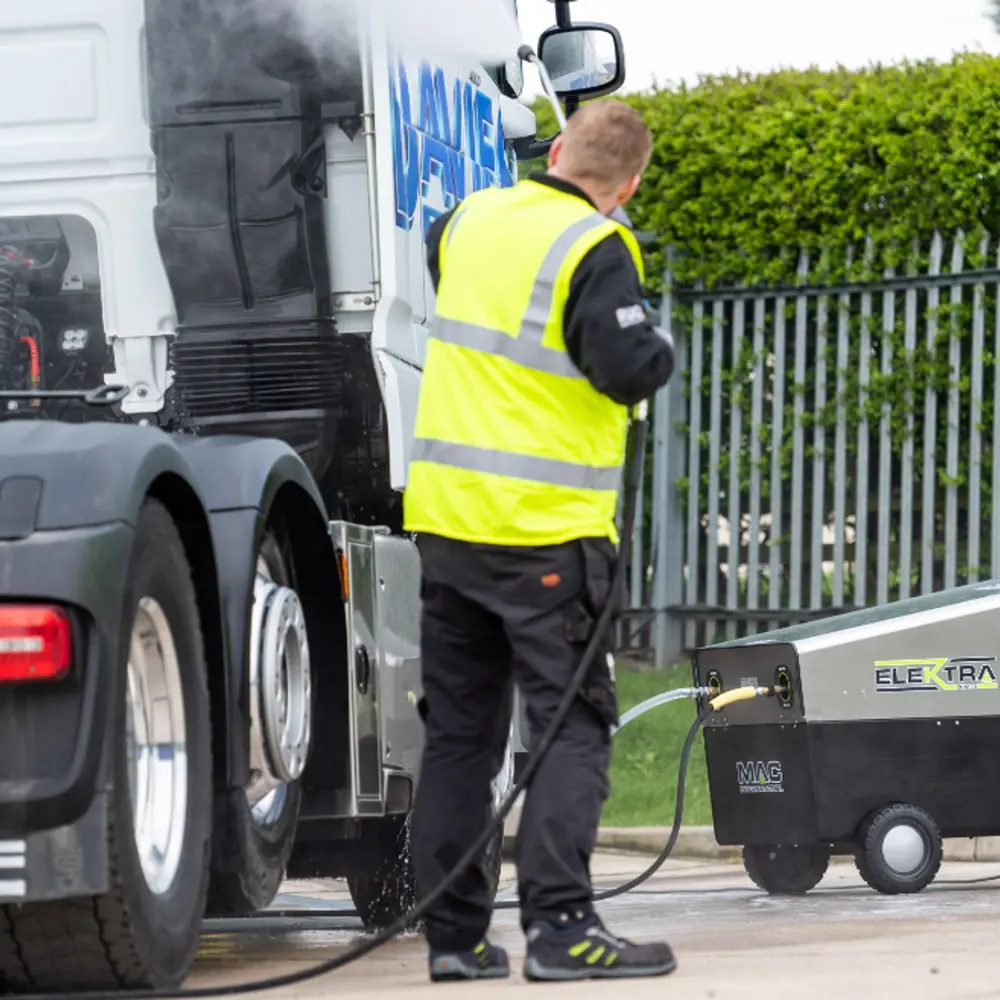 Levert 200 bar warm water op 80°C, verrijdbaar en volledig elektrisch.