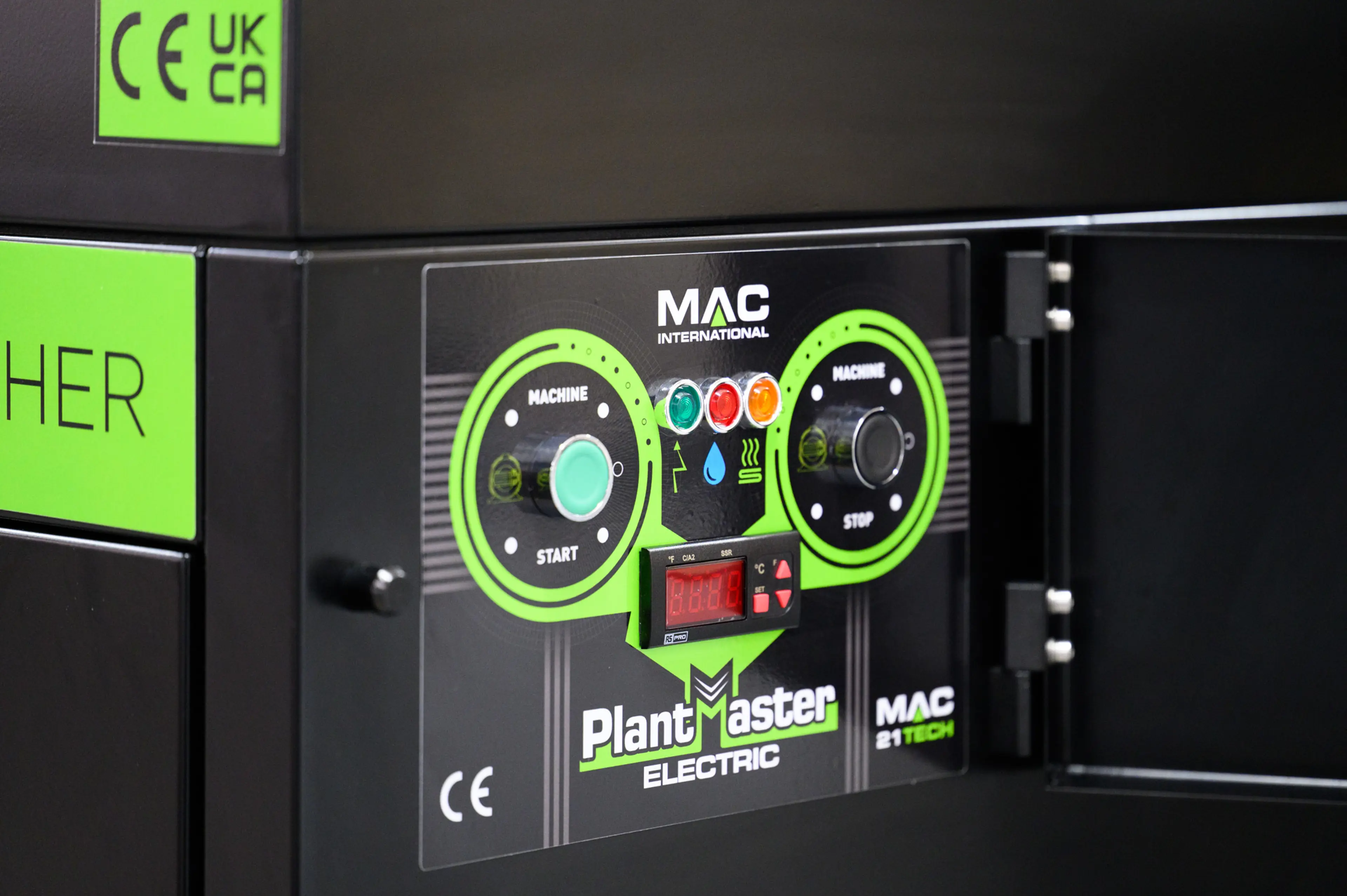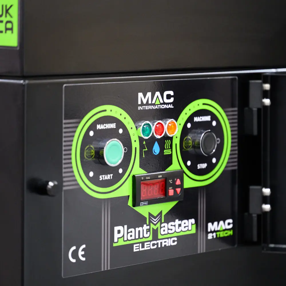 De Plantmaster E4.1 is gebouwd om te werken, dag in dag uit, in de zwaarste omgevingen. De hersluitbare voordeur geeft direct toegang tot alle servicecomponenten. De dubbel geïsoleerde 375-liter boiler domineert het binnenwerk en is de kern van het temperatuurverhaal. Buiten: een compacte, weerbestendige behuizing in gecoat staal of volledig RVS, klaar voor een vaste buitenopstelling het hele jaar door.