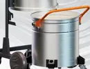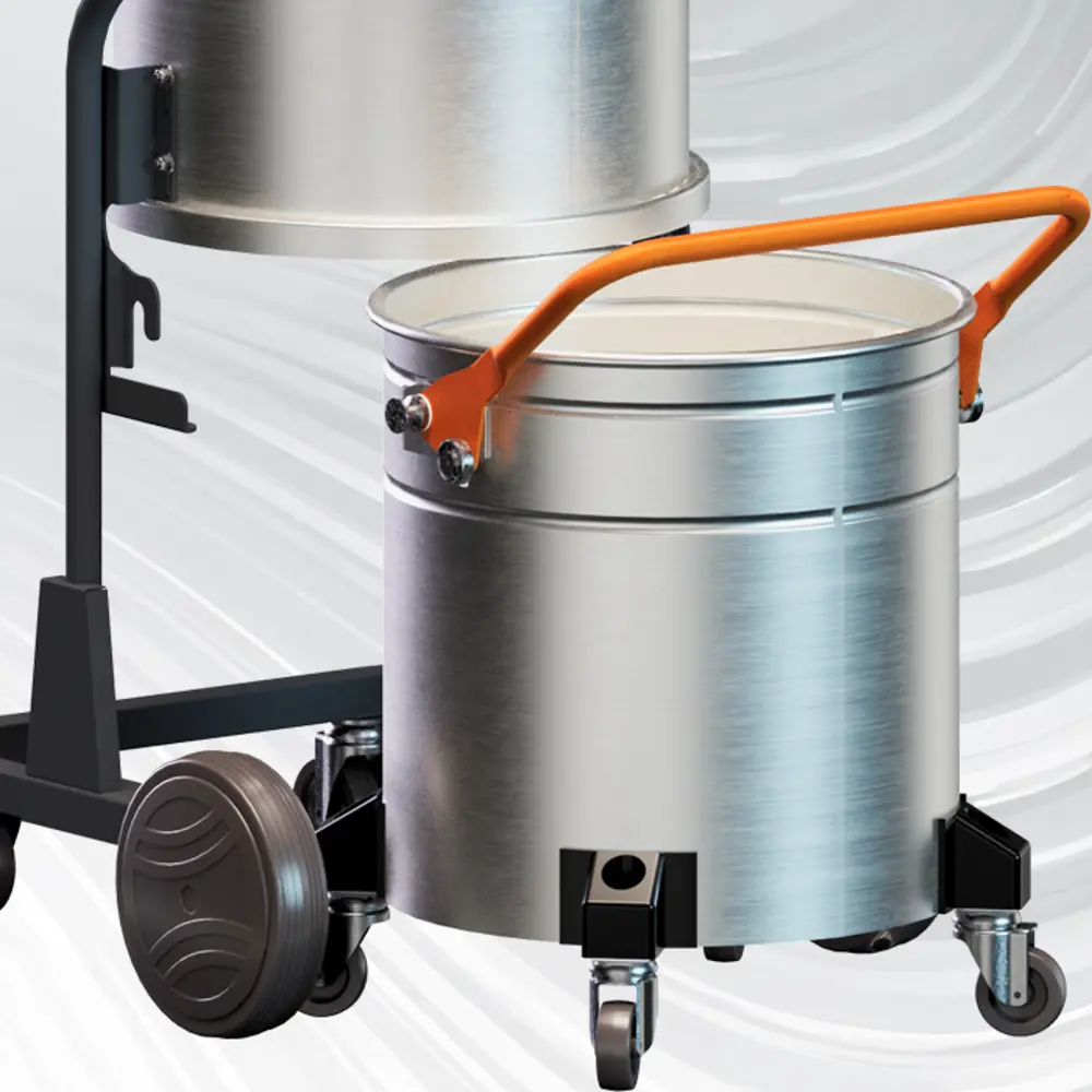 Grote 50 liter opvangketel die eenvoudig te laten zakken is op 4 wielen voor snel en eenvoudig legen bij fijnstof en vloeistof toepassingen.