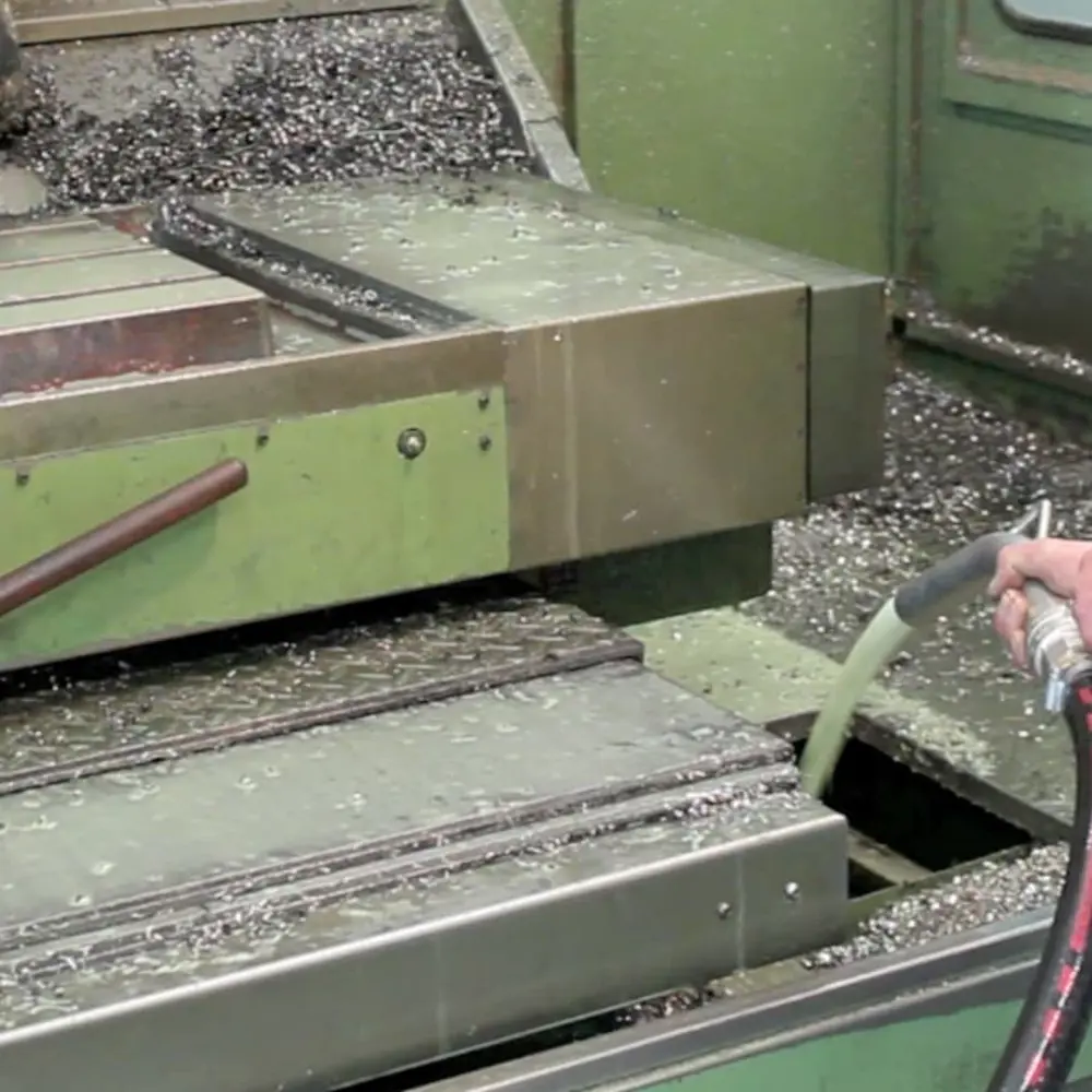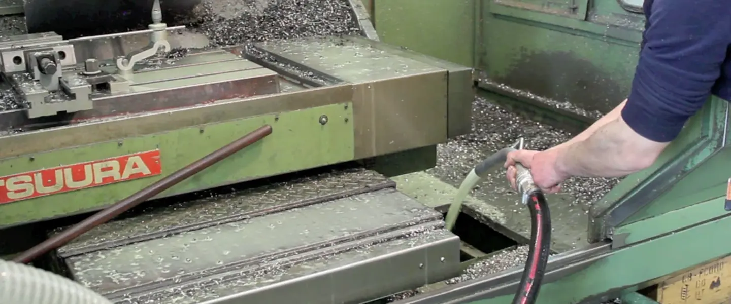 De OIL 80 2M P industriële olie en spaanderzuiger met doorvoerpomp in actie bij CNC-machines.