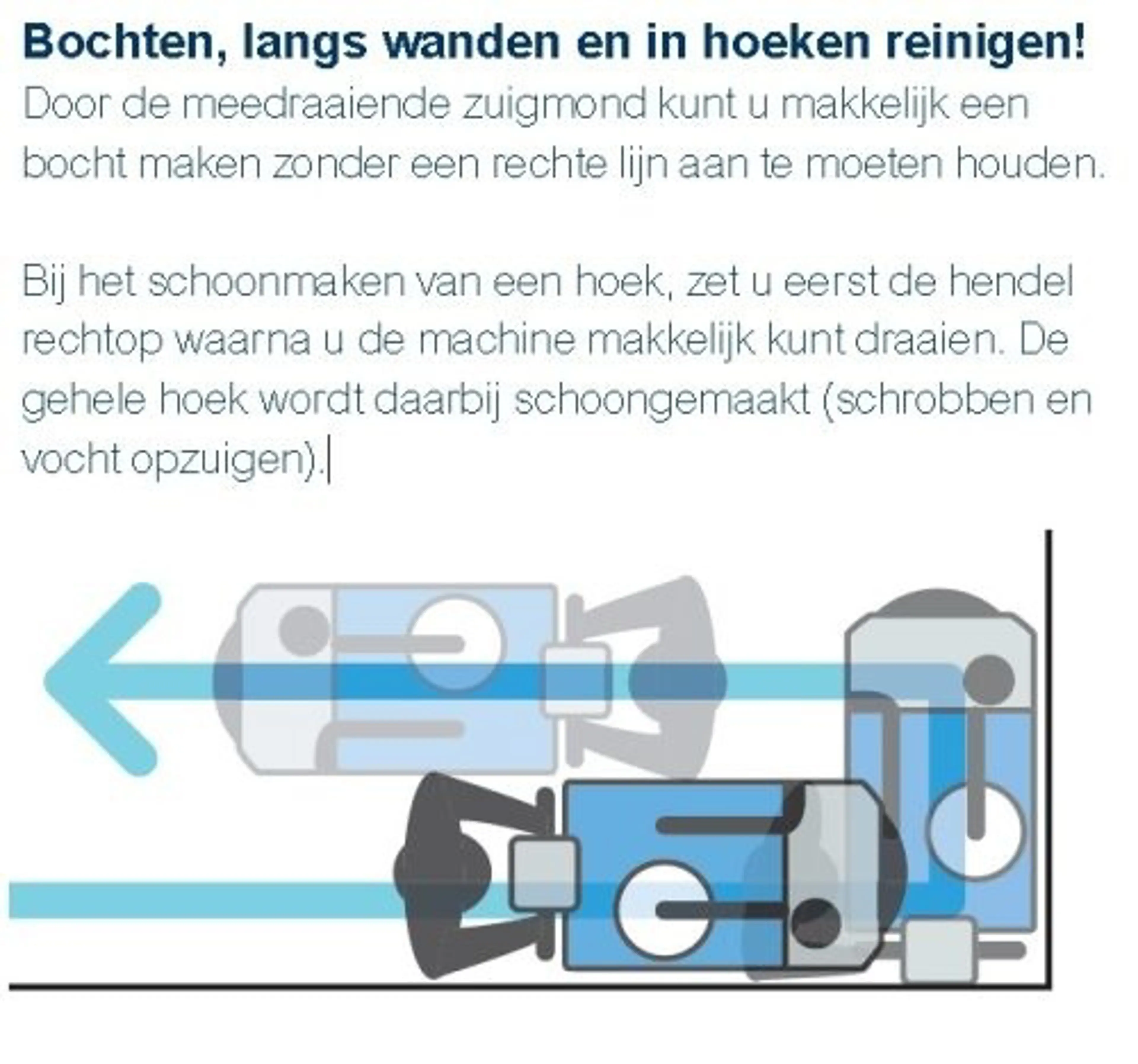 U drukt de duimknop in en de machine trekt zichzelf naar voren. Achter de borstel zuigt de machine het water direct op. De vloer is droog. U draait een bocht, schrobt onder een tafel en keert terug voor de volgende baan. Tussendoor merkt u dat de accu bijna leeg is. U sluit de kabel aan en werkt gewoon door. De machine laadt op terwijl u schrobt.
