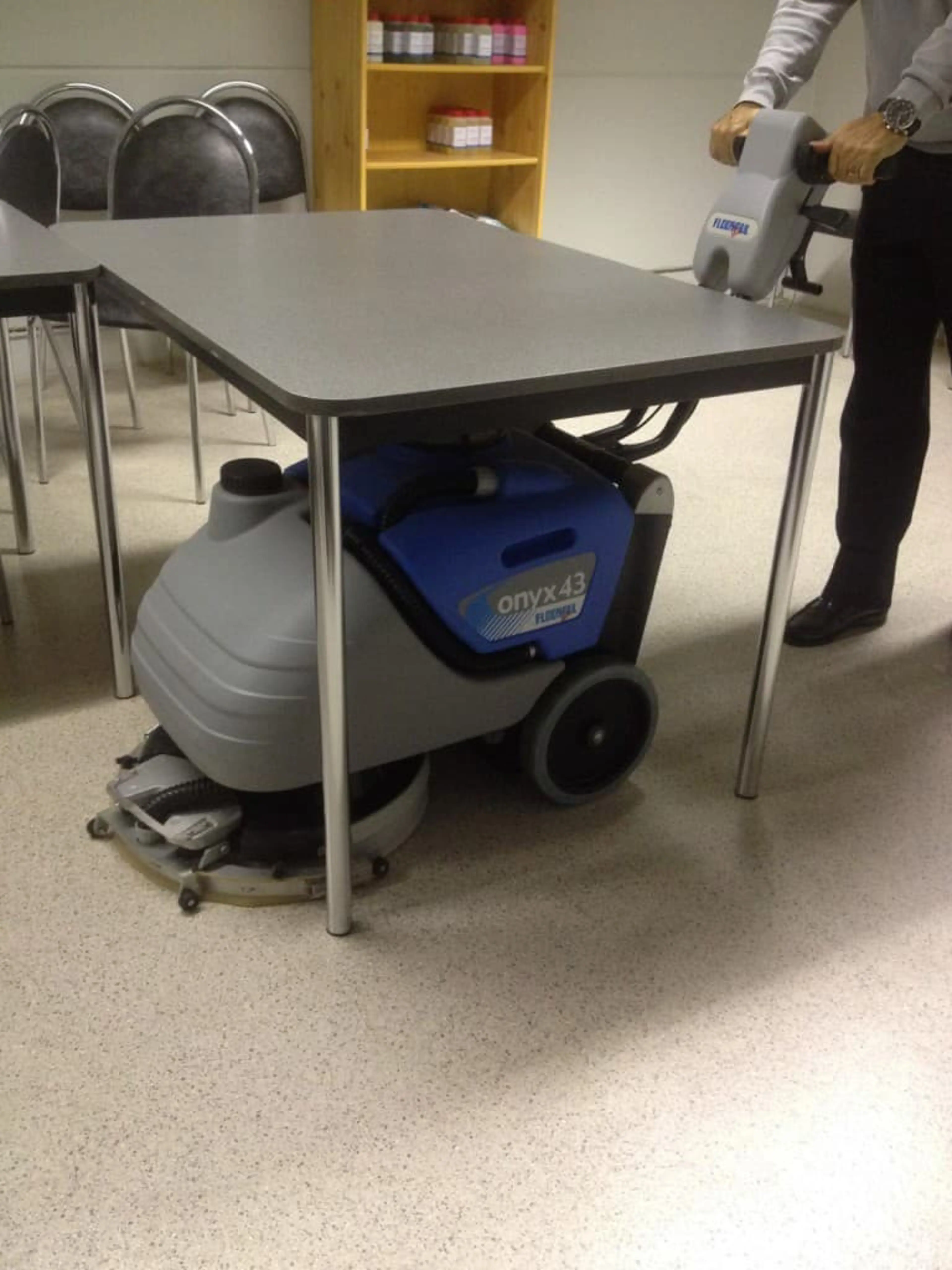 U pakt de Onyx 43B Lithium uit de kast. Hij is merkbaar lichter dan u verwacht. U loopt naar de ruimte die gereinigd moet worden en zet de machine aan. De borstel draait, de machine trekt zichzelf naar voren. U stuurt tussen de tafels door.