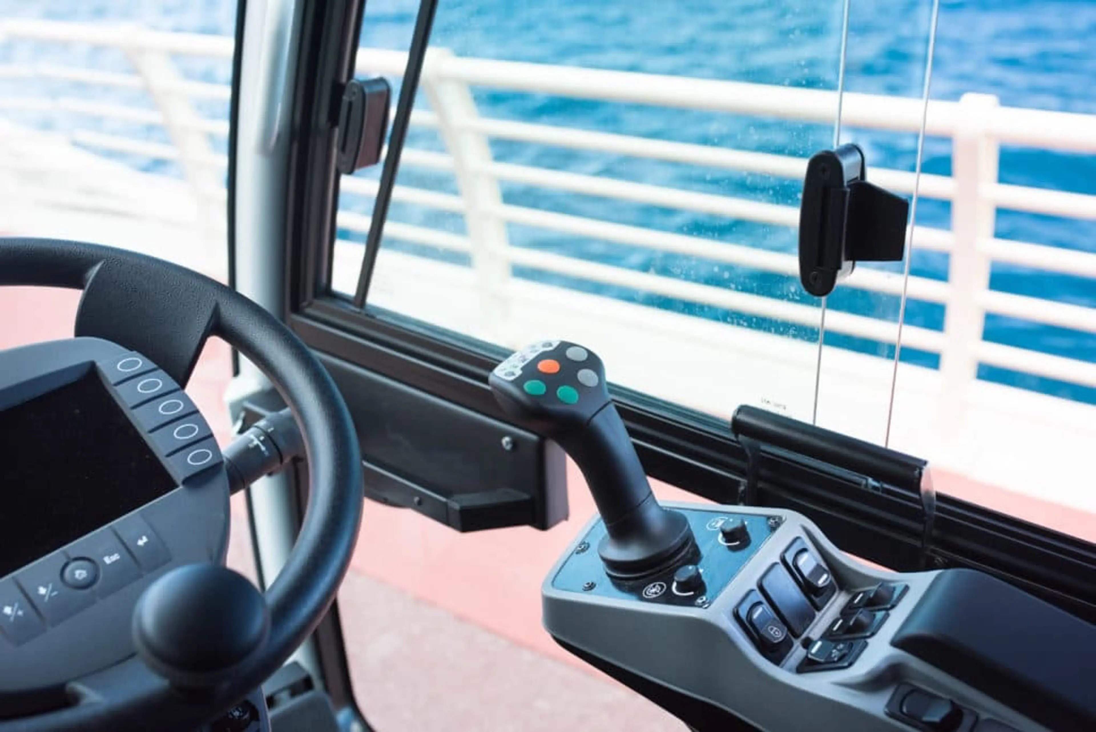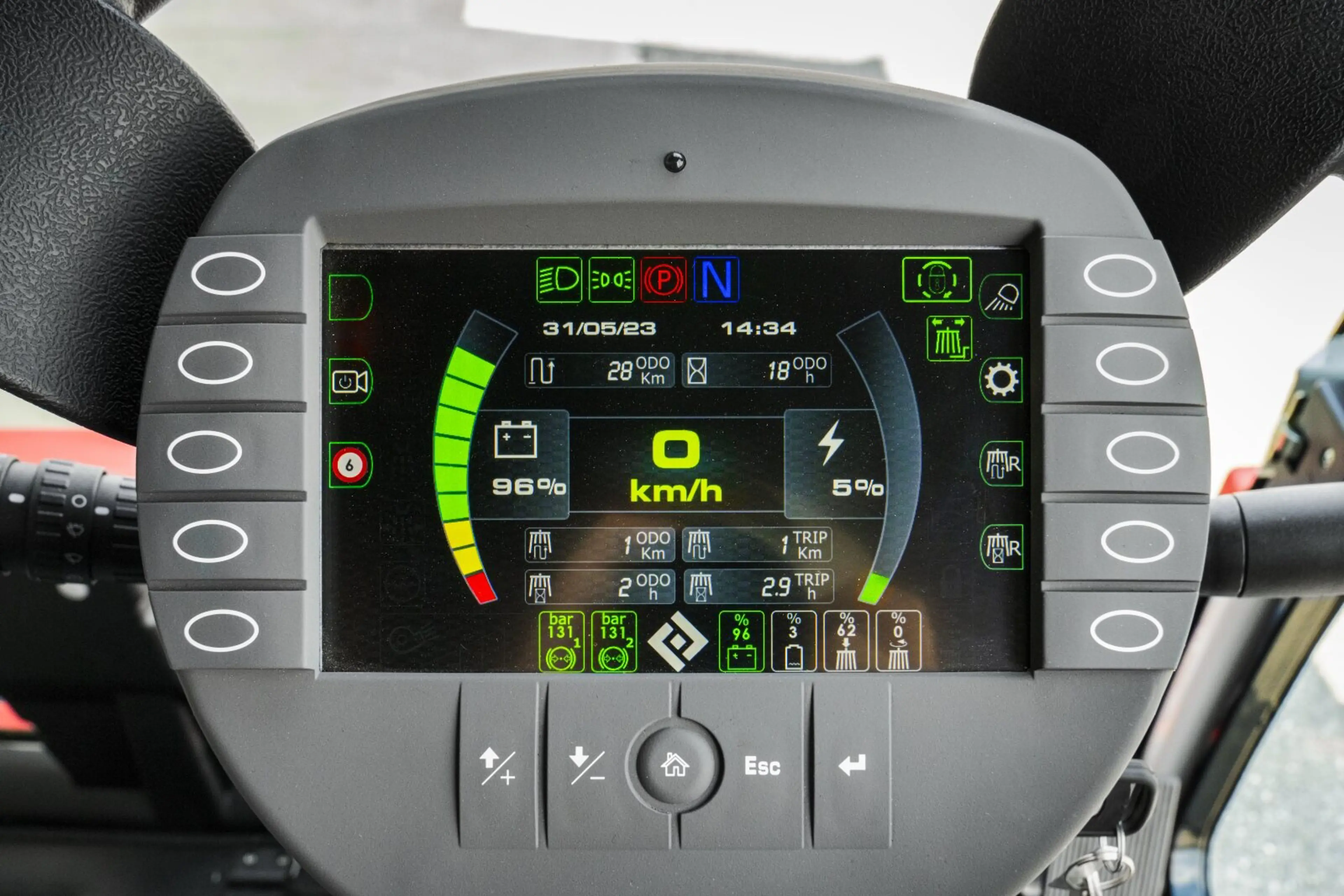 De knikbesturing geeft de machine een draaicirkel die kleiner is dan bij vergelijkbare machines in deze klasse. De breedte van 1.470 mm maakt inzet in smalle straten, voetgangerszones en fietspaden zonder extra manoeuvres mogelijk. Laden gaat via de ingebouwde lader of via een externe snellader met COMBO CCS-aansluiting.
