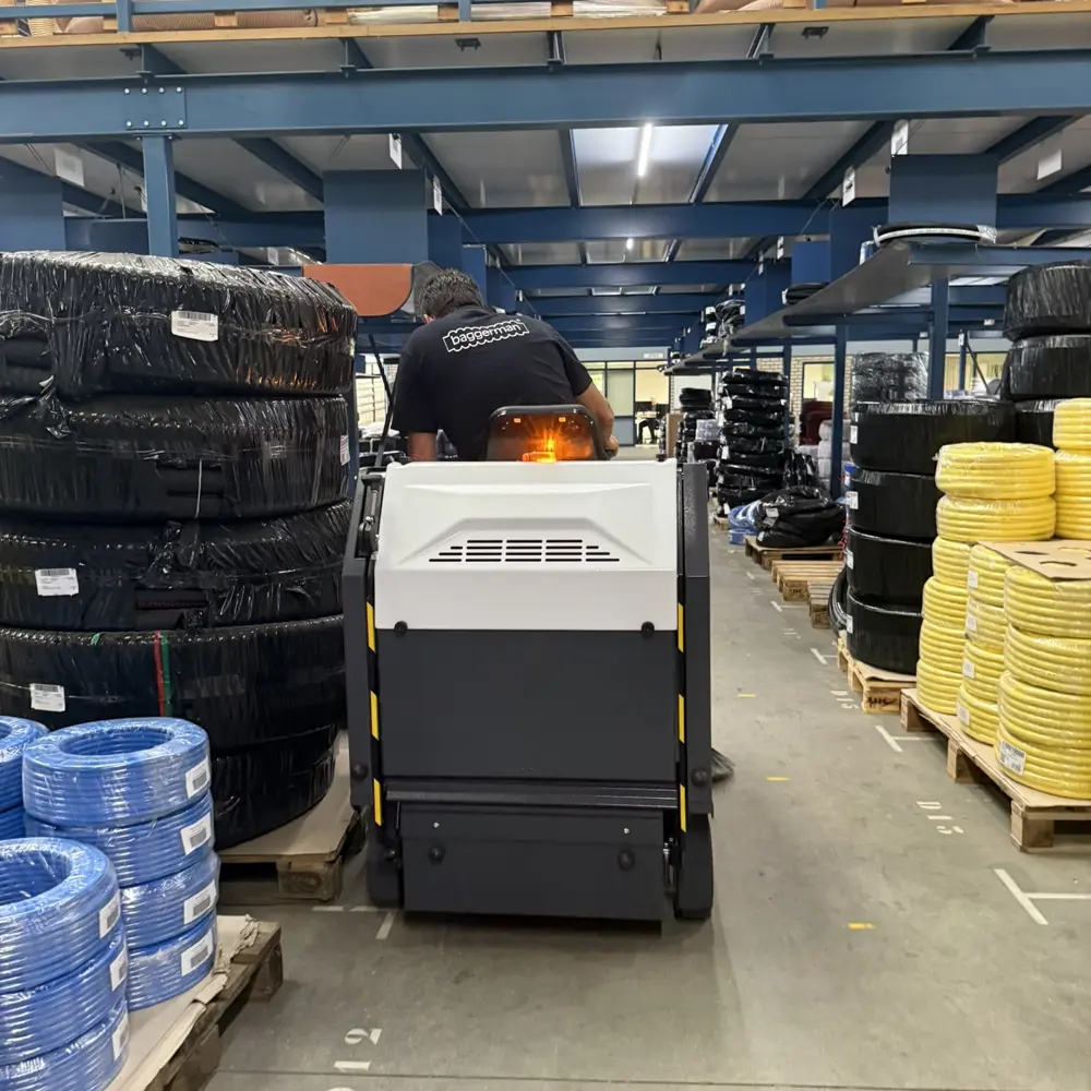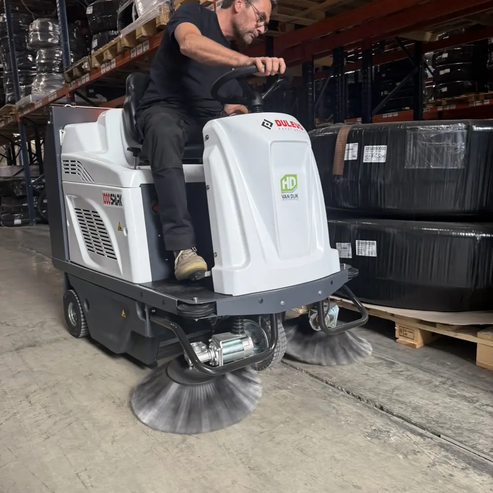 De Dulevo 1000EH HD is compact zonder dat dit ten koste gaat van comfort of capaciteit. De bestuurder zit met volledig zicht op het werkvlak en heeft alle bediening direct bij de hand. De zijborstel klapt automatisch naar binnen bij impact, zodat een aanrijding met een rek of stelling geen schade aan de borstel veroorzaakt. De automatische hooglossing maakt lossen tot 1.450 mm hoogte mogelijk zonder dat de bestuurder hoeft uit te stappen of te tillen. De toegankelijke constructie betekent dat dagelijks onderhoud snel en zonder specialistische kennis kan plaatsvinden, en de batterij-aandrijving zorgt ervoor dat de machine ook werkt in ruimtes waar verbrandingsmotoren niet zijn toegestaan.