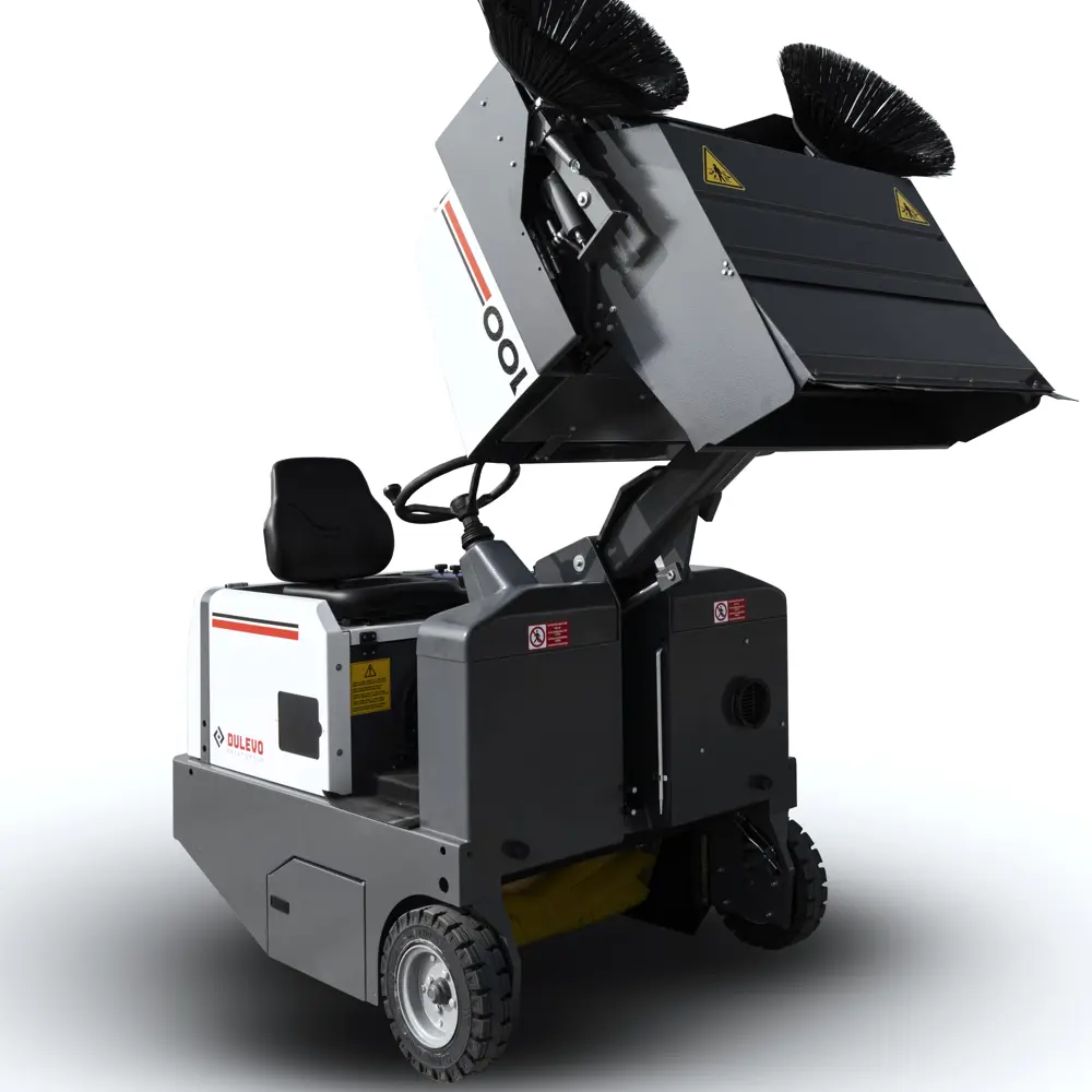 De Dulevo 100 EH combineert de grootste specs in de elektrische Dulevo opzit lijn met de slimme functies die dagelijks het verschil maken. De trolley voor snelle batterijwissel maakt continue inzet over meerdere ploegen mogelijk. Het SBS-systeem regelt de borsteldruk automatisch op oneffen vloeren. De borstels gaan automatisch omhoog bij uitschakelen. De hydraulisch omhooggedrukte vergaarbak maakt lossen eenvoudig zonder uitstappen. De riemloos turbine heeft geen onderhoud nodig. De robuuste stalen frameconstructie en de watergekoelde motor zijn gebouwd voor dagelijkse intensieve inzet in de zwaarste omgevingen.