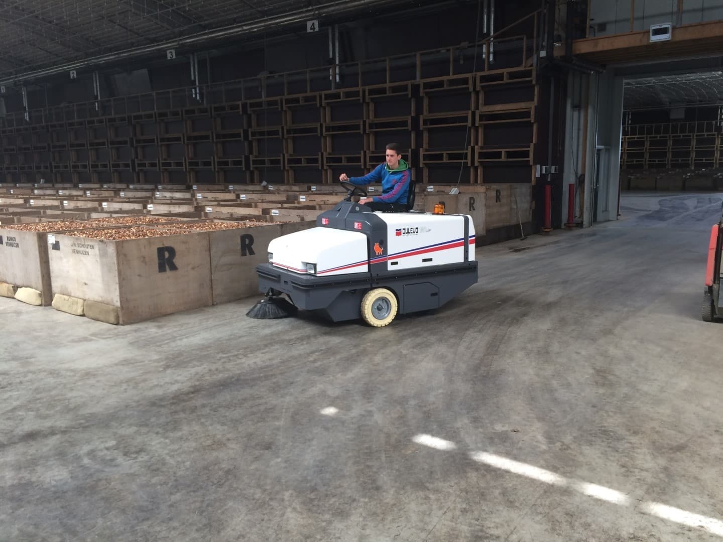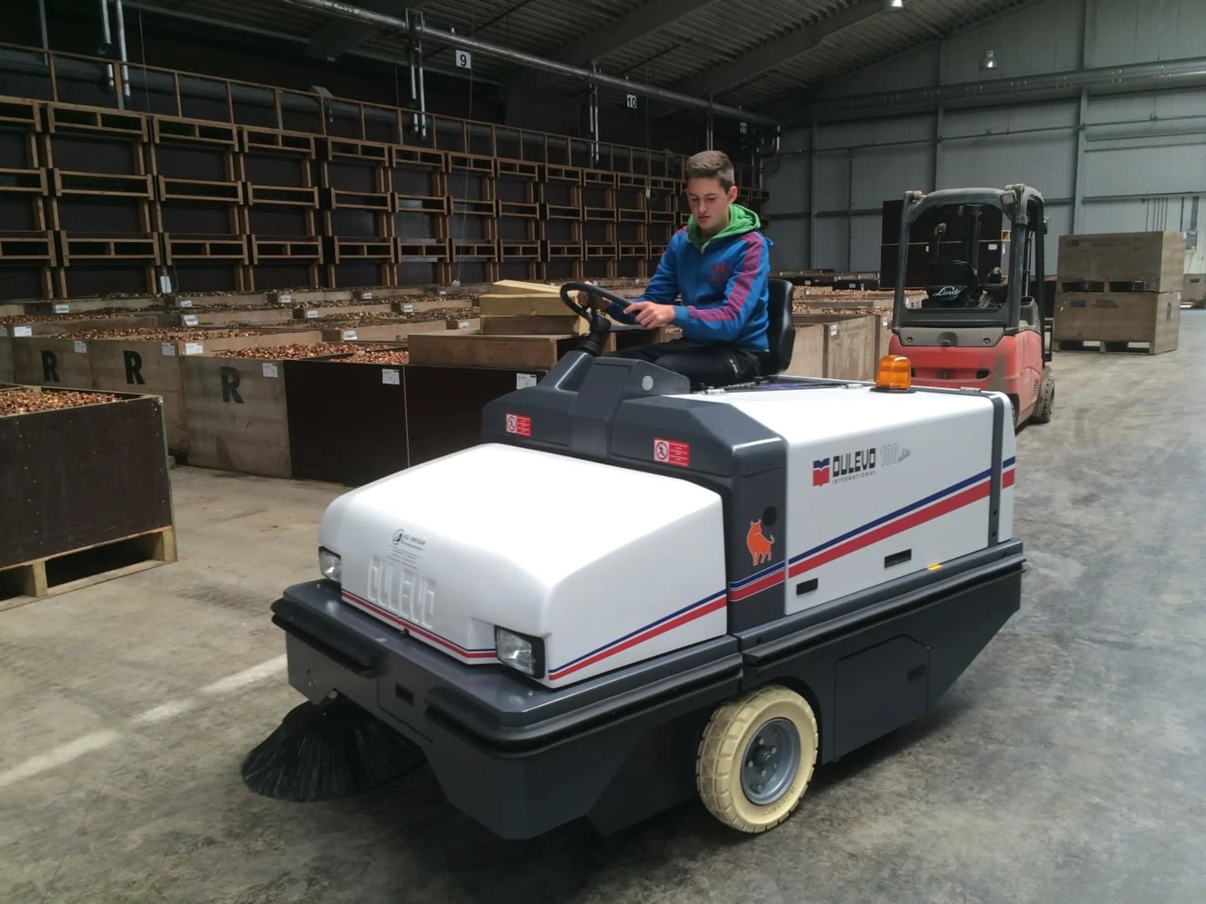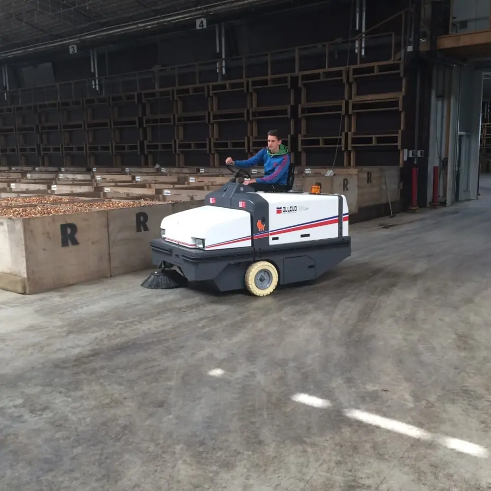 Bekijk de Dulevo 100 EH in werking: wendbaarheid in een industriële omgeving.
