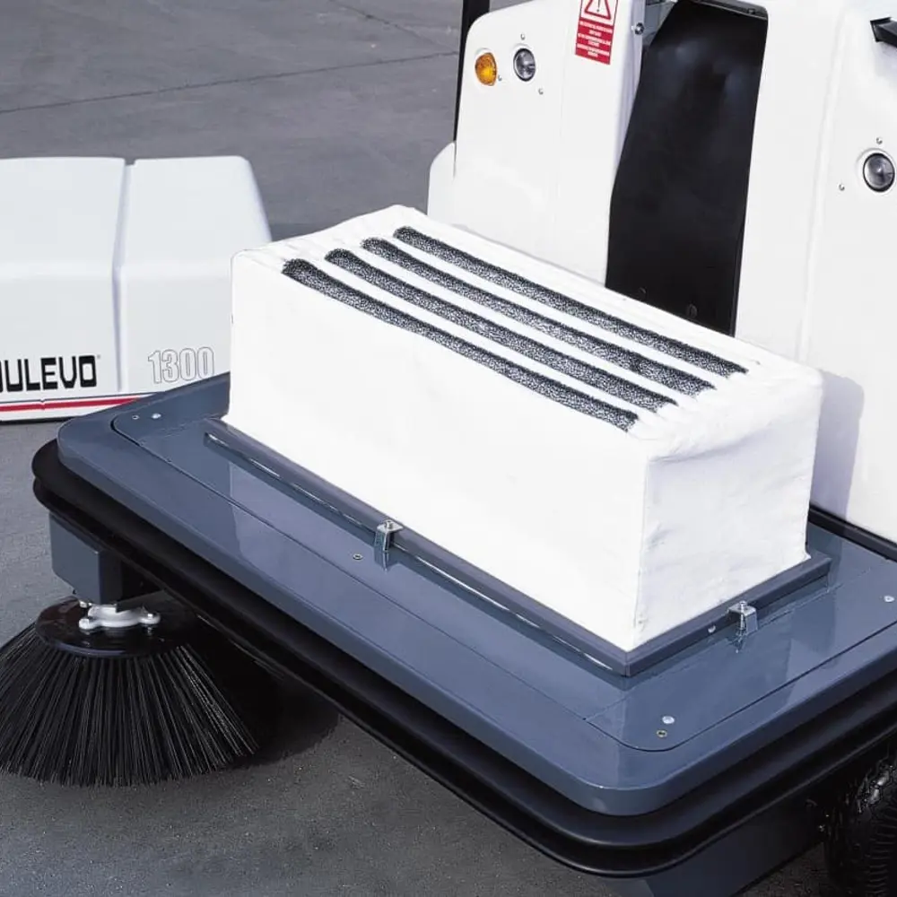 Het slijtvaste stofdoekenfilter filtert tot op 1 micron via het optionele Gore-filter, met 5 jaar garantie van HD van Dijk. De watergekoelde motor garandeert betrouwbare werking bij hoge temperaturen en in verlengde ploegendiensten. Klanten zetten de Dulevo 1300 gemiddeld 10 jaar in.