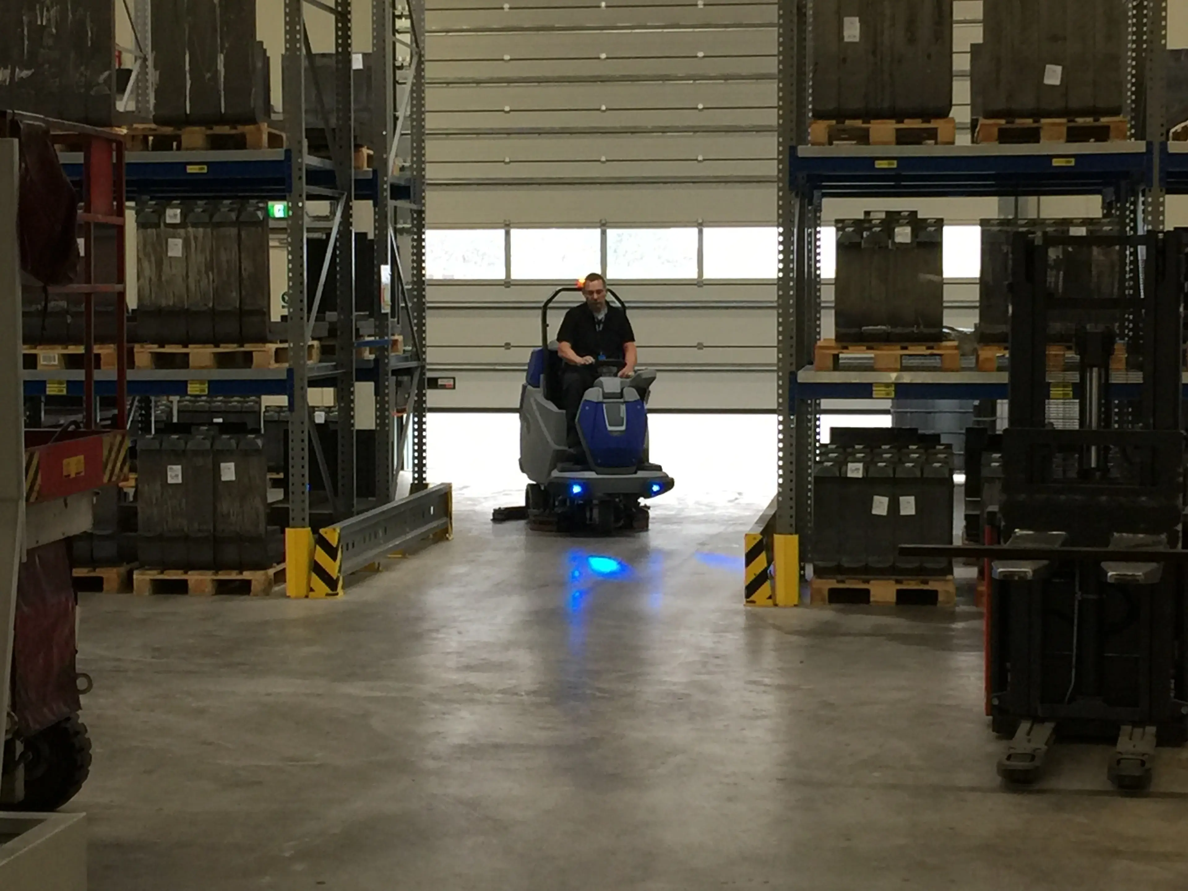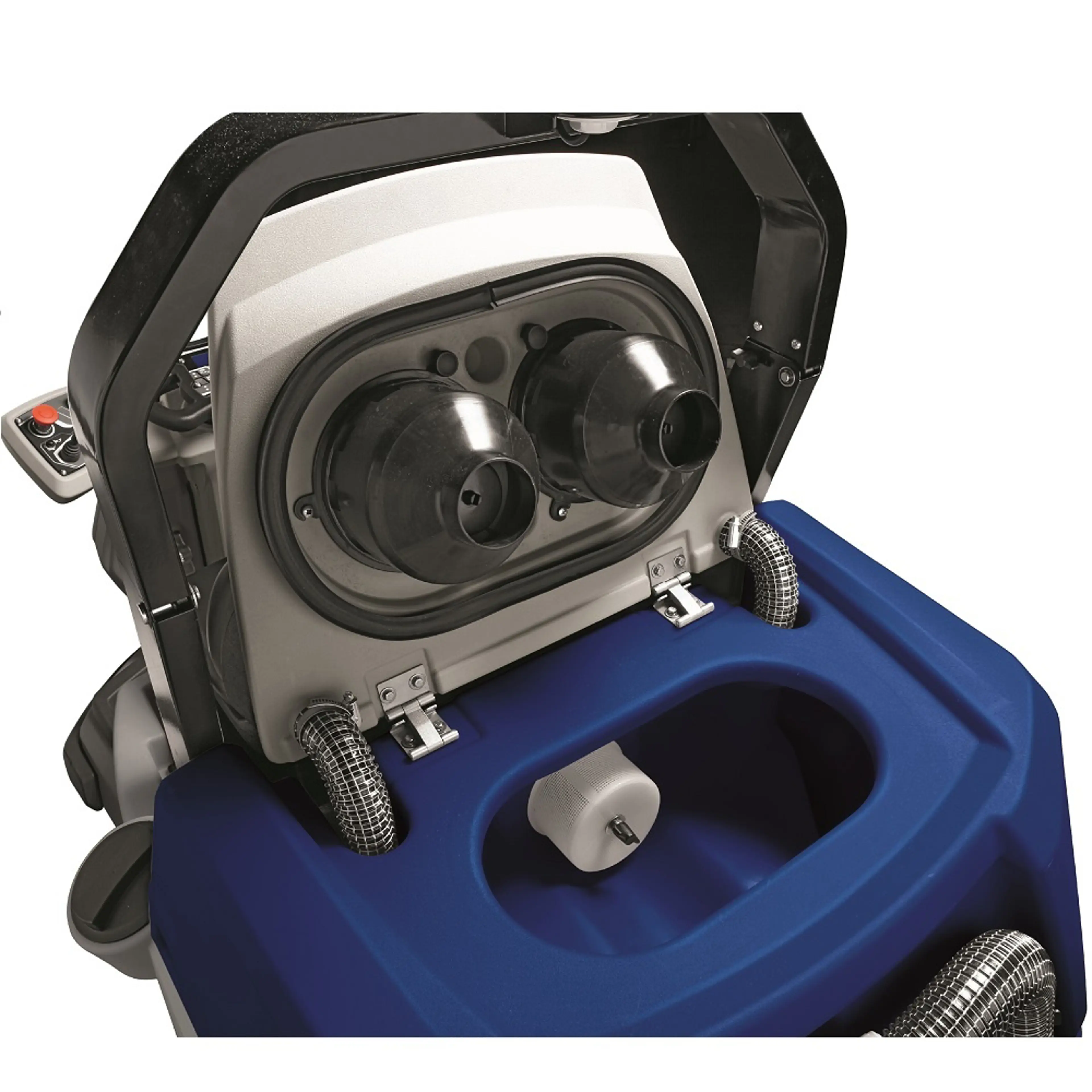 De Topaz 90 lost dit op met een borsteldruk van maximaal 140 kg, twee tegendraaiende schijfborstels van elk 460 mm en een AC-tractiewiel dat ook op hellingen stabiel rijdt. De hoge borsteldruk werkt hardnekkig vuil los dat bij machines met lagere druk achterblijft. Het 3S-systeem zit standaard aan boord en doseert automatisch de juiste hoeveelheid water op basis van de rijsnelheid, wat verspilling voorkomt zonder dat de machinist iets hoeft in te stellen. Twee krachtige 3-traps zuigmotoren met een onderdruk van 190 mbar zorgen voor een directe droge vloer na elke baan.