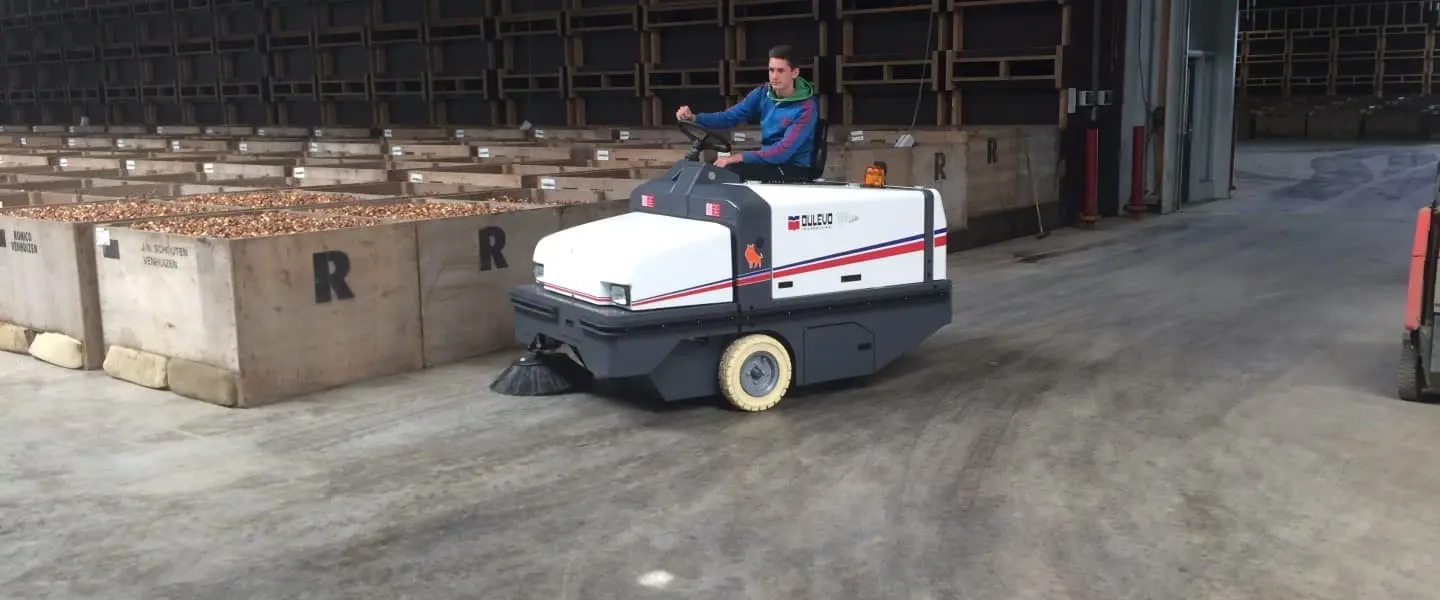 Het bewerken en transporteren van bloembollen genereert dagelijks veel fijnstof dat neerslaat op grote vloeroppervlaktes. Er was behoefte aan een industriële veegmachine die grote hoeveelheden fijnstof aankan zonder te verstoppen. Omdat het soms vochtig kan zijn, moest het filter ook bestand zijn tegen vochtige omstandigheden.