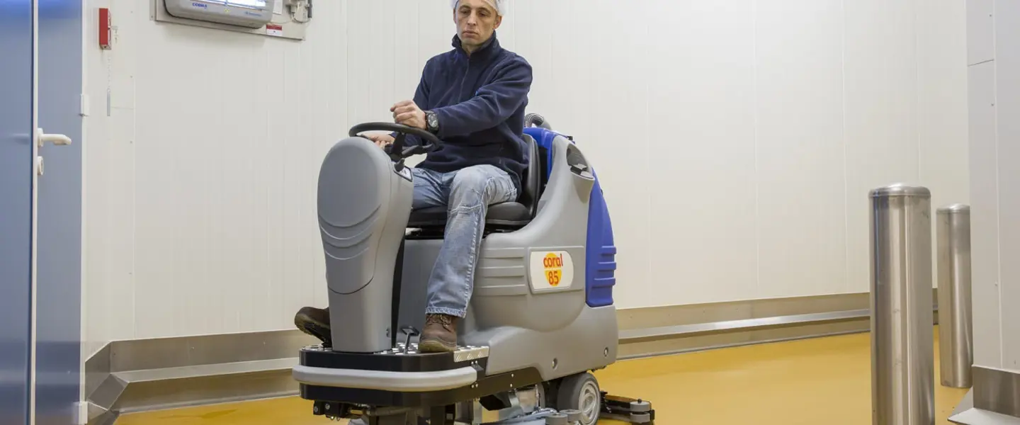 HD Floorpul Coral 85 voor Agouty: industriële zit schrobmachine voor grote bakkerijvloeren.