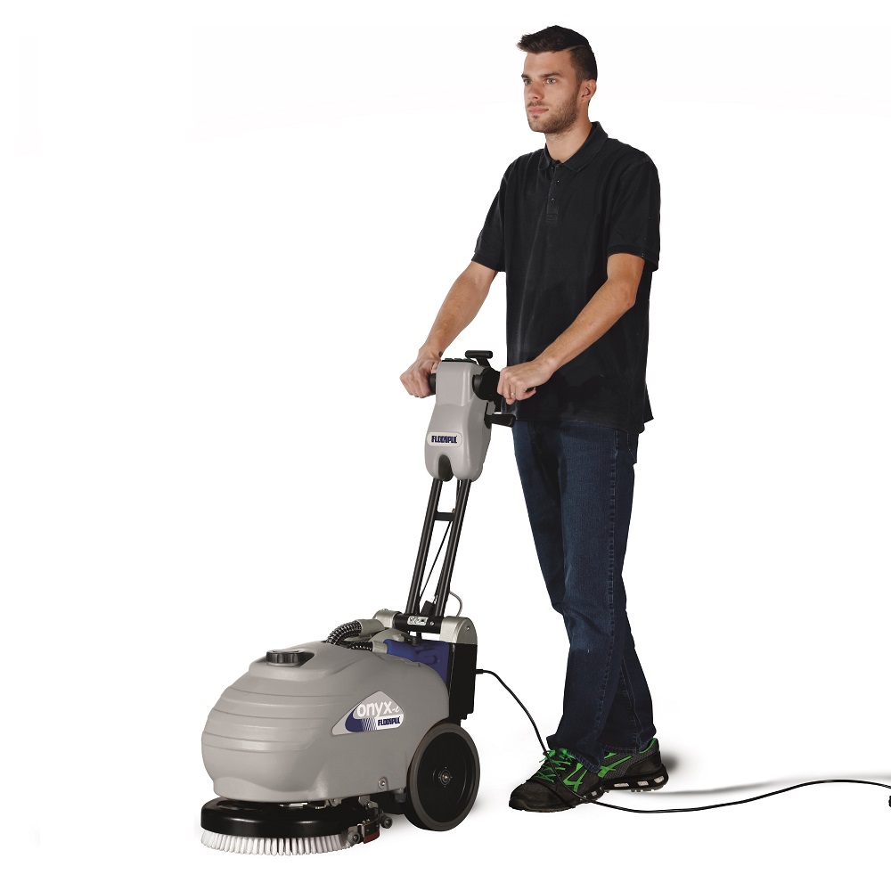 De kleinste 230Volt schrobzuigmachine van HD Floorpul is de Onyx 35E. Uniek in zijn klasse is de borsteldruk van maar liefst 30 kg, waardoor uitstekende resultaten (schoon en droog) worden behaald op tegelvloeren en gladde vloeren. Door een laag geluidsniveau (<70dbA) hindert u de omstanders niet. Middels de 20 meter lange stroomkabel hebt u een groot bereik.